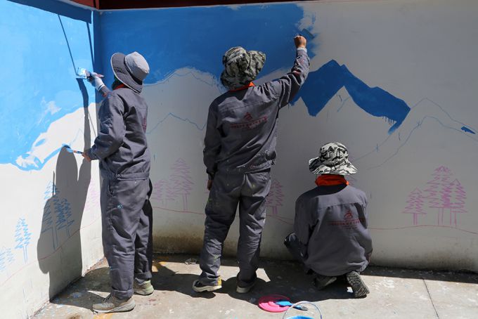 20多天的工作时间里,他们挥汗如雨,他们夜以继日,克服所有的困难,只为了看见日喀则城市中美丽的壁画和市民们美丽的笑脸。