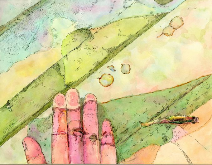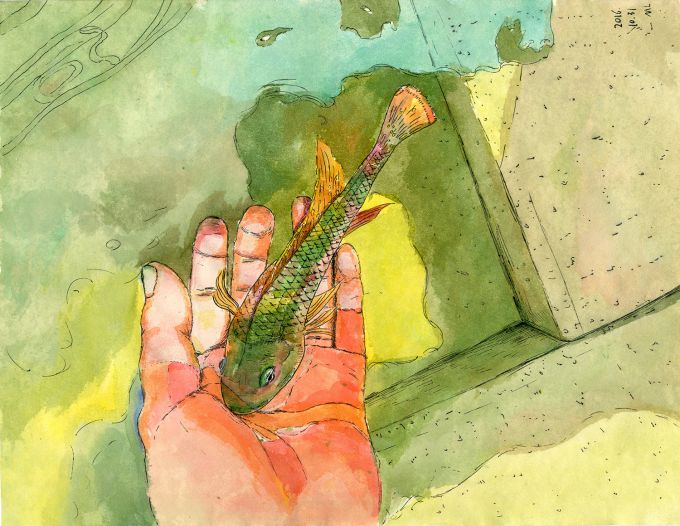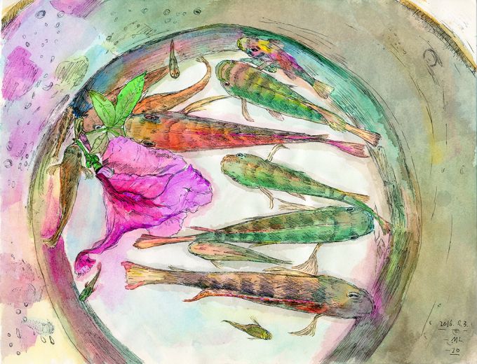 作品《小鱼儿》以分镜头故事漫画的形式,由动漫学院动画艺术系胡浩老师进行绘本指导。作品描述了小女孩在偶然间发现床底的小鱼儿并帮助它们回家的暖心故事。作者满丽通过多次的绘制、改画,不允许一点差错;用铅笔打稿、马克笔勾线,水彩上色的方式的进行创作,清新的画风,表达对童真向往的同时也是在对自己成长的憧憬,希望这个世界就像画面里的那样清澈干净,时常怀着感恩的心,满怀希望与爱。